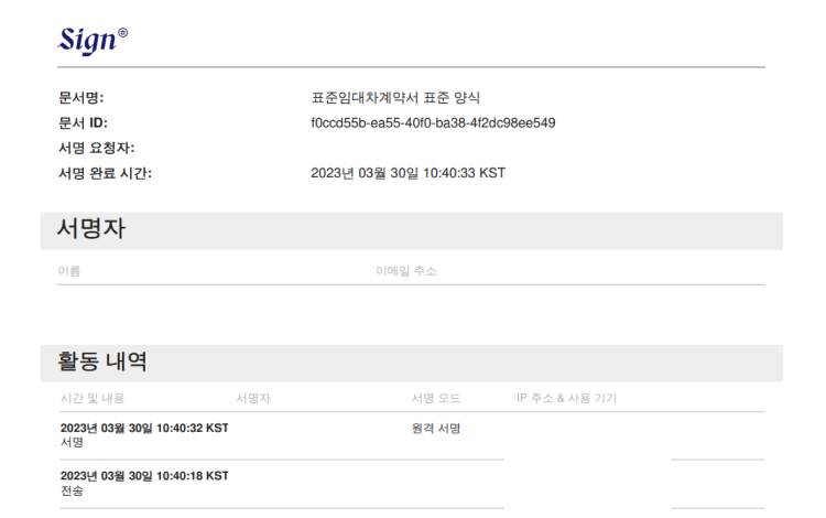 서명이 완료된 문서는 상세한 전자서명 활동 이력이 기록된 감사추적